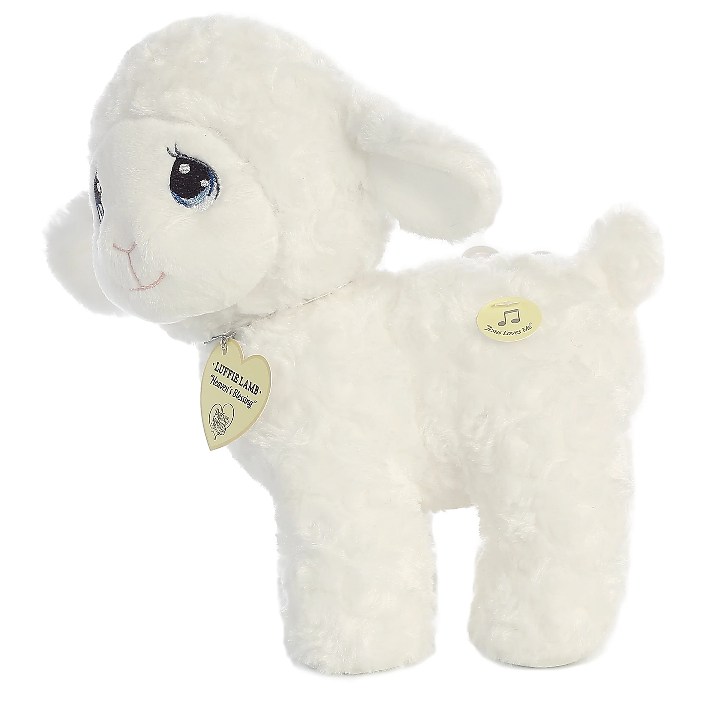 - Each Precious Moments plush comes with an inspirational saying on a heart-shaped tag